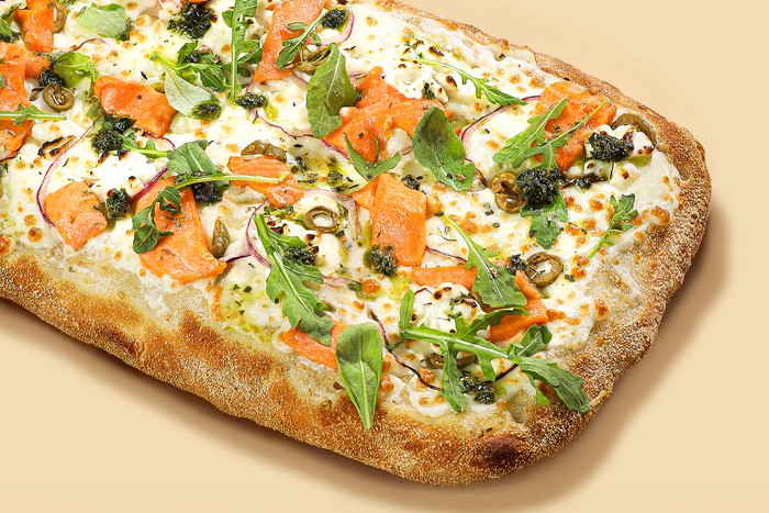 Лосось, сливочный сыр, руккола, оливки, красный лук, моцарелла, сливочный соус и соус песто