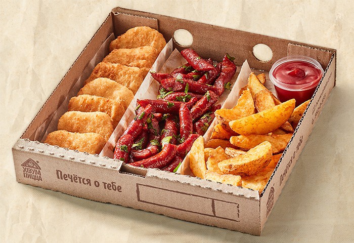 Картофельные дольки, куриные наггетсы, охотничьи колбаски, кетчуп