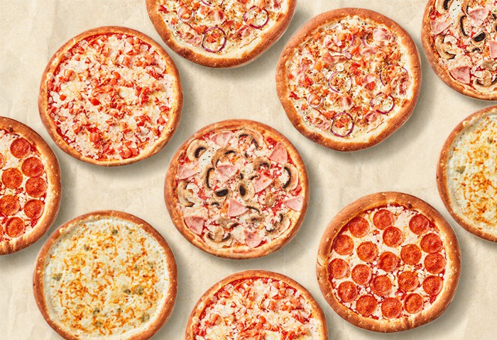 В комбо 10 пицц, по 2 пиццы каждого вида: Пепперони, маргарита, ветчина и грибы, с беконом, 4 сыра