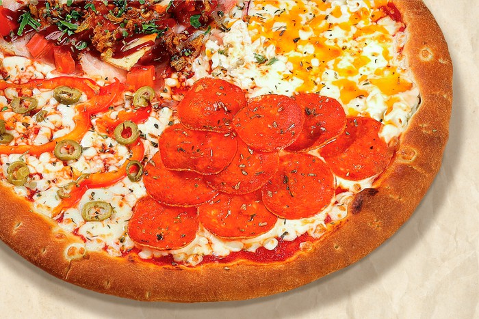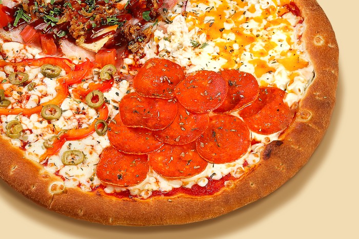 Салями Пепперони, бекон, курица. Томат, болгарский перец, оливки, лук красный, петрушка, лук фри. Моцарелла, чеддер, сливочный сыр, томатный соус и соус барбекю