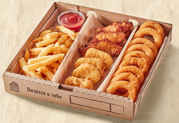 Картофель фри, крылышки Баффало острые, луковые кольца, наггетсы и кетчуп