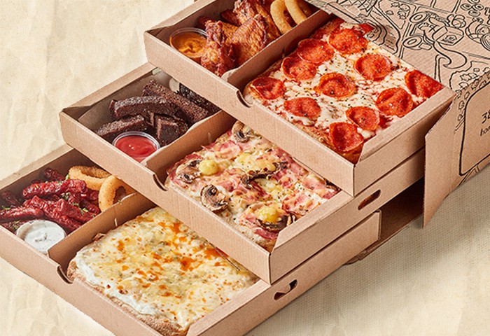Римская пицца Сливочная карбонара, римская пицца Пепперони, римская пицца 4 сыра, охотничьи колбаски, крылышки Баффало острые, гренки чесночные, луковые колечки, кетчуп, сметанно-чесночный соус и соус спайси