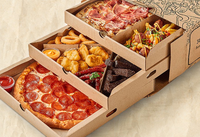 Пицца Двойная Пепперони 30см, римская пицца Барбекю, картофель фри, фрикадельки, наггетсы, охотничьи колбаски, гренки чесночные, луковые колечки, соус сырный, соус кетчуп