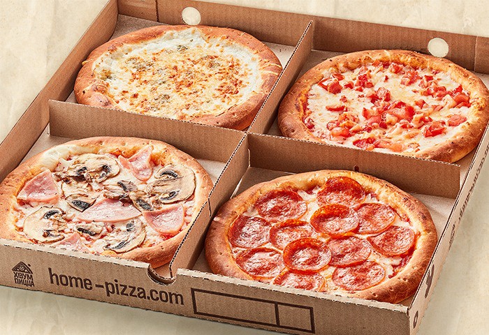 Четыре пиццы по 20 см: 4 сыра, Пепперони, Маргарита, С ветчиной и грибами