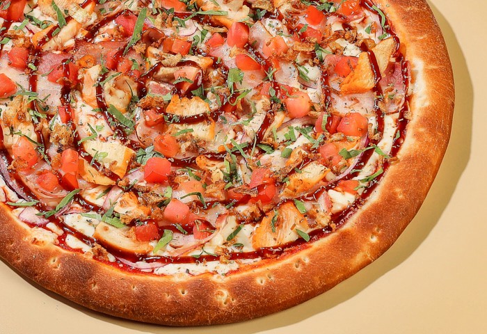 Бекон, куриное филе, томаты, моцарелла, красный лук и томатный соус, украшается зеленью, луком фри и соусом барбекю