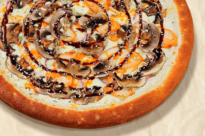 Куриное филе, шампиньоны, чеддер, красный лук и сливочный соус. Украшена кунжутом и соусом терияки